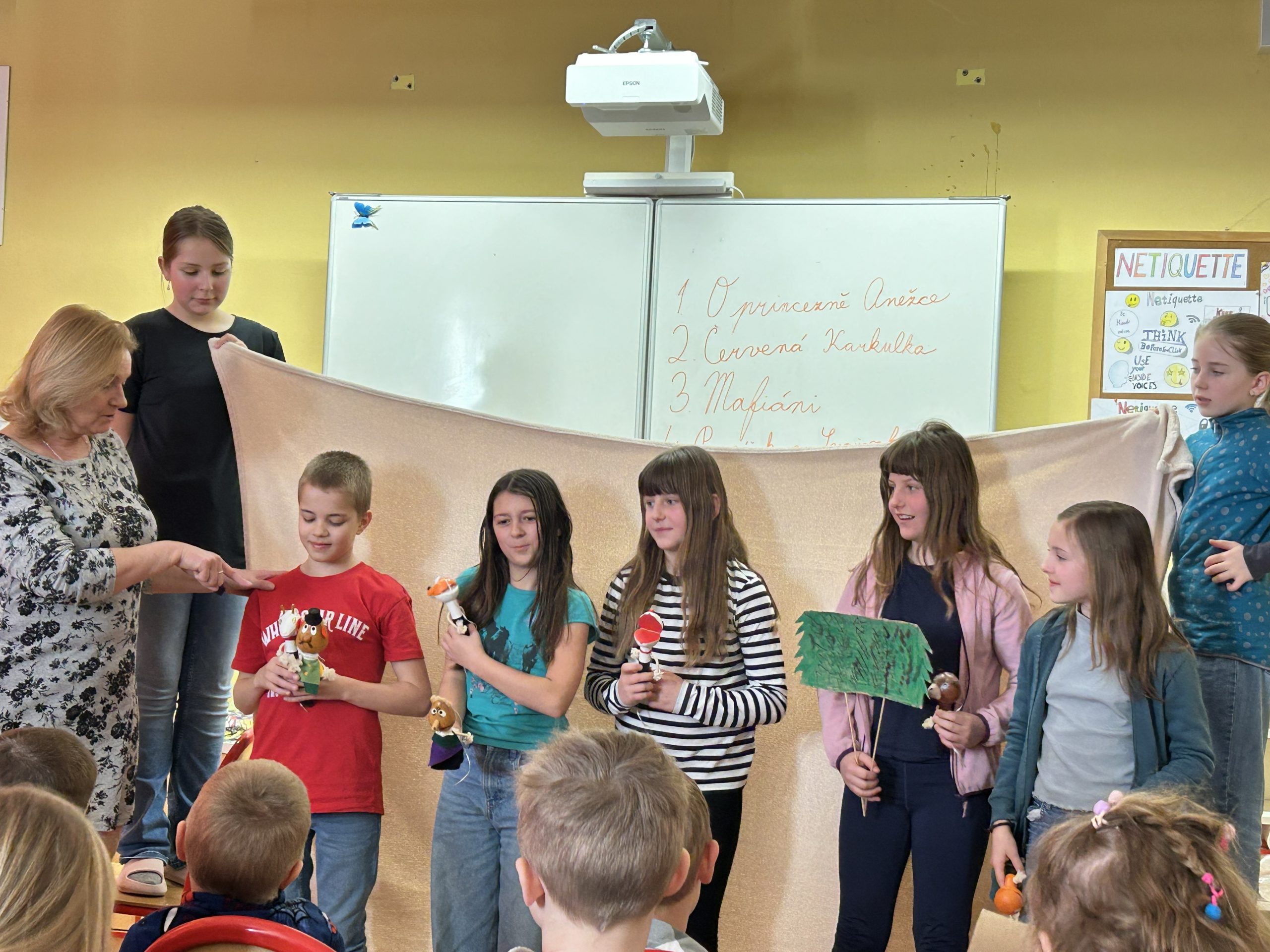Pátek 13. (března)…, pro spoustu lidí nešťastný den, ale my, Berušky z MŠ v Počaplech, jsme se na něj hodně těšily. Pozvali nás totiž na návštěvu do ZŠ naši kamarádi z 5. A. Nebylo to naše první setkání. Už loni na jaře pro nás školáci z této třídy připravili Čarodějnickou stezku na Borech. Co si asi pro nás kluci a holky vymysleli tentokrát? Překvapili nás divadelním představením! Všechny děti ze třídy se rozdělily do pěti skupin a každá skupina nám zahrála svoji loutkovou mini-pohádku. Kdo nebyl loutkoherec, podílel se na představení jako vypravěč, oponář, osvětlovač nebo tvůrce kulis. Všechny pohádky nás moc pobavily